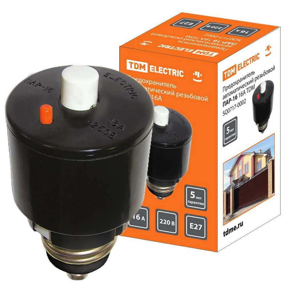 Предохранитель автоматический резьбовой ПАР-16 TDM  используется для отключения тока при коротких замыканиях и перегрузке, а также для нечастого оперативного отключения бытовых электрических цепей. Устанавливается стационарно в основания предохранителей с резьбой Е27. Страна производитель- Китай.