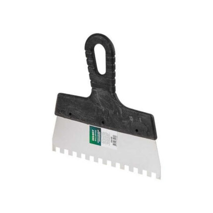 Зубчатый шпатель представляет собой вспомогательный инструмент для ручной укладки плитки. Металлические зубья предназначены для равномерного распределения клея или другой строительной смеси по поверхности укладываемого элемента. Толщину слоя при этом можно варьировать, изменяя степень нажатия на шпатель и угол наклона зубьев. Удобная ручка из пластика имеет отверстие для хранения шпателя в подвешенном положении.