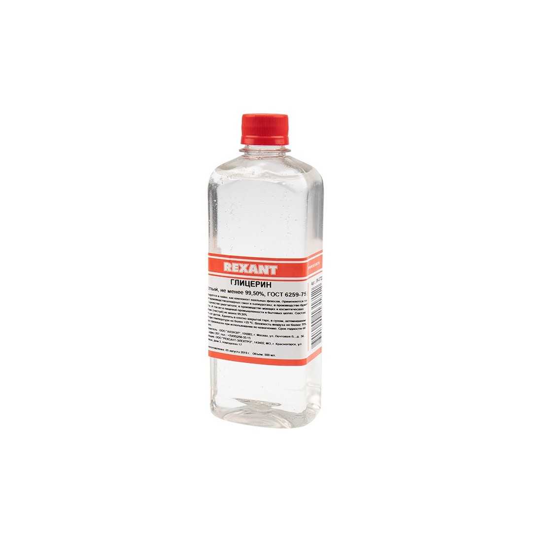 Глицерин 500 мл REXANT — бесцветная, вязкая и очень гигроскопичная жидкость. Смешивается с водой в любых пропорциях. Сладкая на вкус.