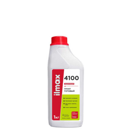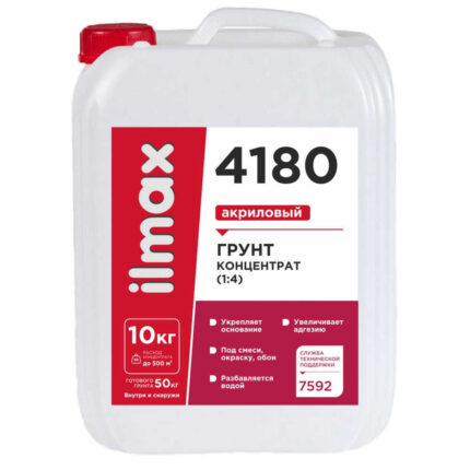 ilmax 4120 – грунт-концентрат (1:1) на основе дисперсии акрилового сополимера проникает в основание, обеспыливая и упрочняя его. После обработки поверхности грунтом снижается водопоглощение, тем самым предотвращается быстрое высыхание наносимых в дальнейшем материалов и обеспечивается их равномерный набор прочности. Обработка грунтом увеличивает адгезию между основанием и наносимыми материалами. После высыхания – прозрачный.
